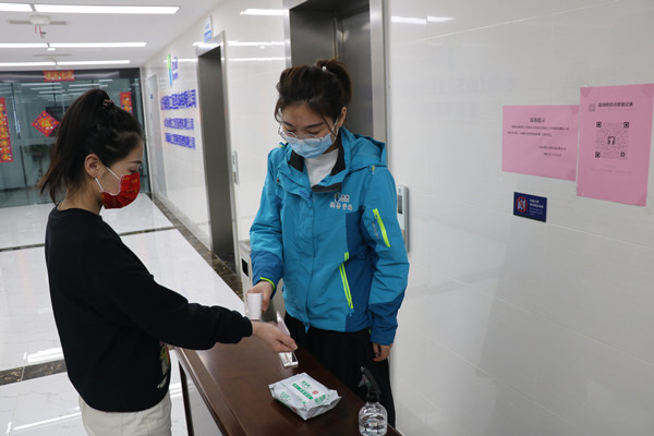 公司在电梯厅设置了消毒处,针对外来人员到访,在手消、测温的基础上,设计张贴了可扫码在线登记的疫情防控登记表,后台实时收集到访人员信息,及时准确掌握外来人员情况。