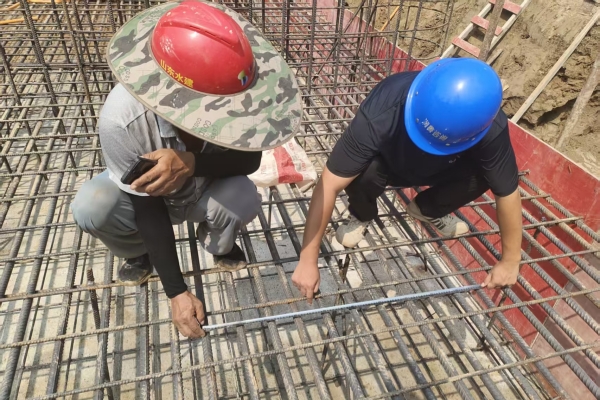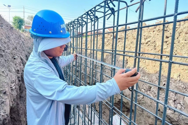 为清水绿岸,高温验筋不停歇。为加速改善城市水环境,郓城县黑臭水体项目在酷暑中全力推进,现场监理工程师不顾高温,正俯身仔细核对钢筋规格型号,手持卷尺精确测量直径,并用卷尺逐一复核绑扎间距与保护层厚度。安全帽下的目光紧锁每一处节点,确保在恶劣天气下,工程质量标准不降、进度可控。
