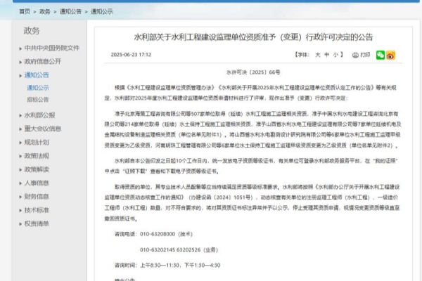 近日,水利部发布《关于水利工程建设监理单位资质准予(变更)行政许可决定的公告》(水许可决〔2025〕66号),山东润鲁集团顺利获得水利工程施工监理甲级资质延续许可,资质有效期为五年。