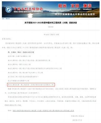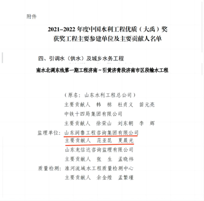 5月5日,2021—2022年度中国水利优质工程“大禹奖”揭晓,山东润鲁集团监理的南水北调东线第一期工程济南~引黄济青段济南市区段输水工程榜上有名!
