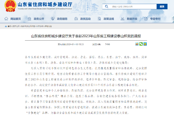 NEWS近日,山东省住房和城乡建设厅发布《关于表彰2023年山东省工程建设泰山杯奖的通报》,公布了2023年山东省工程建设泰山杯奖获奖名单,由山东润鲁集团监理的临沂市郯城县清泉寺拦河闸除险加固工程、潍河莒县段综合治理工程榜上有名,该奖项是山东省建设工程质量管理和引领发展方面的最高综合性奖项。