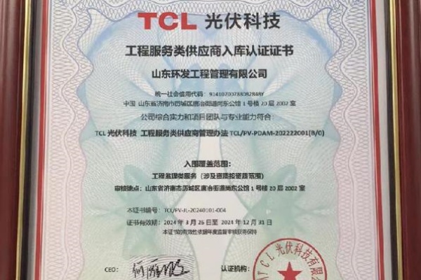 NEWS4月2日,山东润鲁集团权属公司山东环发工程管理有限公司收到TCL光伏科技工程服务类供应商入库认证证书,在全国数十家监理企业中脱颖而出,标志着环发工程公司正式入围TCL光伏科技2024年度工程监理服务类供应商。
