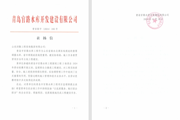 NEWS近日,山东润鲁集团收到来自青岛官路水库开发建设有限公司对青岛市官路水库工程围坝工程2标段监理部的表扬信。信中对我公司监理部在工程优质履约、不等不靠、积极投入,全力推进围坝填筑、泄洪放空洞等年度重要节点目标任务的监理工作给予高度赞扬。